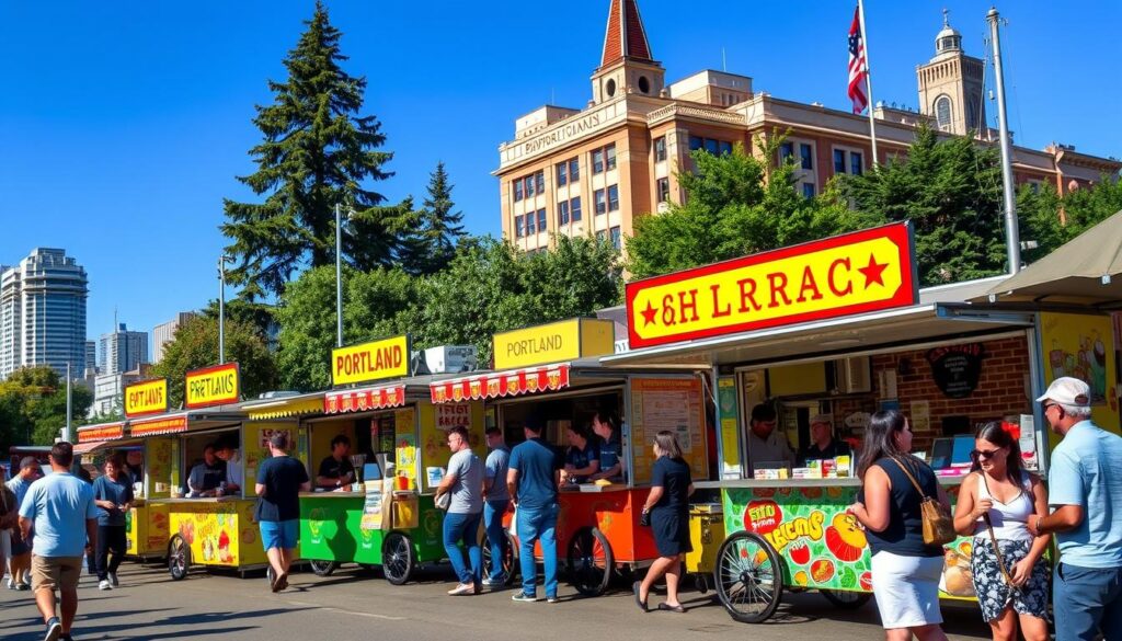 Portland’s food cart pods are famous. They offer a wide range of innovative foods. The scene values sustainability and local ingredients.